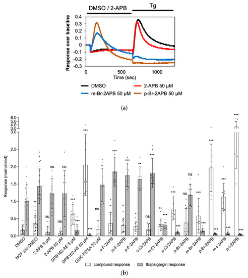 Store-depletion by selected 2-APB analogues in MDA-MB-231 cells. (a) Examples of recorded intracellular calcium responses for m-Br-2APB and p-Br-2APB in FLIPR assay. Black bars above traces indicate duration of compound applications. MDA-MB-231 cells were incubated with compounds (50 µM, unless otherwise noted) in NCF for 10 min, followed by thapsigargin (Tg, 2.5 µM) application in NCF buffer. (b) Quantifications of Ca2+ mobilization effect from intracellular stores, using the slopes of the curves, by compounds (white bars) and by subsequent thapsigargin (dark bars) application. Normalized to post-thapsigargin response by DMSO, n ≥ 9 for all data points. Data shown are mean ± SD. Statistical significance is compared to the respective DMSO control and indicated as “***” for p ≤ 0.001, “**” for 0.001 < p ≤ 0.01 and “*” for 0.01 < p ≤ 0.05. ns, not significant for p > 0.05.