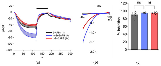 Inhibition of ICRAC in HEK293 cells overexpressing human STIM1/Orai1 by 2-APB (black traces) and analogues m-Br-2APB (blue) and p-Br-2APB (red). (a) ICRAC was evoked with 20 mM BAPTA and 50 µM IP3 in the patch pipette, currents at −130 mV were normalized to cell capacity and plotted as current density (CD) versus time. Upon ICRAC development, 2-APB (black), m-Br-2APB (blue) or p-Br-2APB (red) were applied from 120–180 s (black bar above traces). (b) I-V curves extracted from recordings in (a) when ICRAC had developed at t = 118 s. (c) Inhibition of ICRAC was calculated from CD at 180 s normalized to the point in time before compounds were applied (t = 118 s) and plotted as inhibition in %. All compounds applied at 50 µM, number of experiments (n) in brackets in panel (a). Data shown are mean ± SD. Statistical significance is indicated as ns for not significant (p > 0.05).