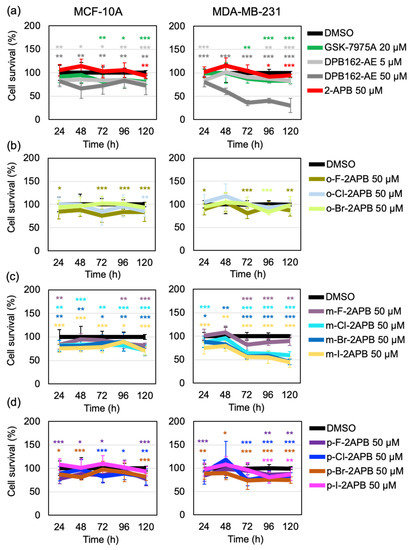 Dose-response curves of 20 µM GSK-7975A, 5 µM and 50 µM DPB162-AE, and 50 µM 2-APB (a), 50 µM o-F-2APB, o-Cl-2APB, and o-Br-2APB (b) 50 µM m-F-2APB, m-Cl-2APB, m-Br-2APB, and m-I-2APB (c), and 50 µM p-F-2APB, p-Cl-2APB, p-Br-2APB, and p-I-2APB (d) in non-tumorigenic breast epithelial cell line MCF-10A and triple negative breast cancer cell line MDA-MB-231. Relative cell survival in case of each compound treatment was calculated as a percentage of DMSO control. Data shown are mean ± SD (n = 12/compound for each time point) of two independent experiments. Significance levels compared to the DMSO control are indicated as “*” for 0.01 < p ≤ 0.05, “**” for 0.001 < p ≤ 0.01, or “***” for p ≤ 0.001 and not indicated if non-significant (p > 0.05).