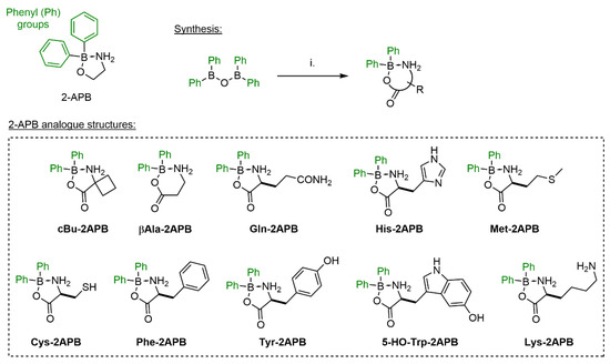 Others and we have shown previously that amino acid adducts of 2-APB, forming acyloxyboranes, are less dynamic in solution than the corresponding amino alcohol esters [67,80]. Furthermore, our studies indicated that amino acid 2-APB adducts with large side chain might block SOCE in HEK293 cells efficiently. In order to study this more systematically, we expanded our 2-APB library in this direction and synthesized several amino acid complexes shown in Scheme 2. Conveniently, such derivatives can be synthesized in one step from diphenylborinic anhydride.