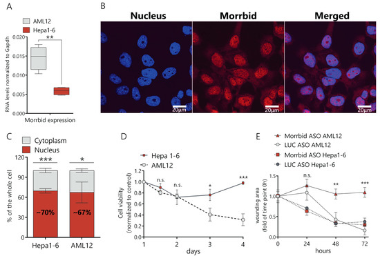 Characterization of Morrbid long noncoding RNA (lncRNA) expression, cellular localization and knockdown phenotype. (A) Comparison of Morrbid expression levels in AML12 normal murine hepatocytes and the Hepa1-6 hepatoma cell line with RT-qPCR. (B) Fluorescence in situ hybridization analysis (FISH) of Morrbid localization in AML12 cells (DNA was stained with Dapi and Morrbid was stained with a Cy5-labeled probe). (C) RT-qPCR analysis of Morrbid expression in the nuclear and cytoplasmic fractions extracted from AML12 cells. (D) Viability assay of Hepa1-6 and AML12 cells depleted in Morrbid, on the 1, 1.5, 2, 3 and 4 days of knockdown, normalized to control the luciferase antisense oligonucleotides (LUC ASO) treatment and viability at day 1 after the initial transfection. (E) Wound-healing assay of Morrbid knockdown (KD) and LUC control KD in AML12 and Hepa1-6 cells. The wound was introduced just after the initial transfection, and data were normalized to the wound area at the first timepoint. Results show mean ± SD. n.s.—not significant. * p < 0.05, ** p < 0.01 and *** p < 0.001.