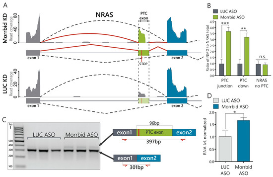 Morrbid lncRNA depletion leads to the enhanced incorporation of the NRAS premature termination codons (PTC) exon in murine hepatocytes. (A) RNA coverage of the zoomed region of the NRAS transcript in Morrbid and LUC control knockdowns. The solid and dashed arced lines represent the RNA coverage of the splice junctions. (B) RT-qPCR analysis of the NRAS isoform expression after Morrbid KD and control LUC KD using primers laying on the junction between the PTC exon and neighboring exons (PTC junction) and spanning across the junction to the downstream neighboring exon (PTC down). (C) Image of amplicon separation by agarose gel electrophoresis. Amplicons were obtained with primers spanning across the alternative NRAS exon to amplify the PTC and no PTC NRAS transcripts. (D) RT-qPCR analysis of the NRAS pre-mRNA level in the control LUC and Morrbid KD cells using primers that amplify the fragment with exon1 and intron. NMD: nonsense-mediated decay. Results show mean ± SD. n.s.—not significant. * p < 0.05, ** p < 0.01 and *** p < 0.001.