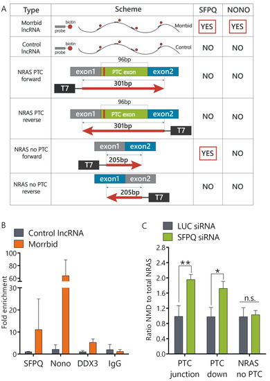 Previously, it was shown that SFPQ and NONO proteins can interact with pre-mRNA regulatory elements and affect alternative splicing [26,27]. In order to verify if the SFPQ-NONO heterodimer can directly interact with NRAS pre-mRNA, we performed an RNA pulldown analysis using biotinylated transcripts of four minigenes. These constructs were: (1) minigene coding a full NRAS PTC exon flanked with 68 nt of exon1 upstream and 137 nt of exon2 downstream, (2) minigene coding an exon1-exon2 fusion with a missing PTC exon and (3) and (4) controlling minigenes that were created by inverting sequences of the first two constructs (Supplementary Figure S2C). A mass-spectrometry analysis of RNA pulldown samples unambiguously confirmed the interaction of SFPQ proteins with the NRAS total minigene (Figure 3A). Therefore, the SFPQ protein interacts directly with both lncRNA Morrbid and NRAS mRNA, while the NONO protein interacts with Morrbid lncRNA.