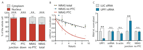 NRAS PTC transcript is degraded in the cytosol via the NMD pathway. (A) RT-qPCR analysis of NRAS PTC, no PTC transcripts and NRAS total in the nuclear and cytoplasmic fractions extracted from AML12 cells. (B) Estimation of the NRAS transcripts degradation rate by an actinomycin D assay. (C) RT-qPCR analysis of gene expressions after 6 days of knockdown of the UPF1 protein. Results show mean ± SD. n.s.—not significant. ** p < 0.01 and *** p < 0.001. mRNA: messenger RNA.