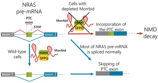 In conclusion, we performed an alternative splicing analysis in murine hepatocytes with Morrbid lncRNA depletion in vitro and found the upregulation of NRAS pre-mRNA and the oncogene isoform with PTC and proved its degradation via the nonsense-mediated decay pathway. We confirmed the direct interactions of Morrbid lncRNA with splicing complex SFPQ-NONO and proposed the mechanism for the regulation of NRAS splicing in murine hepatocytes by alternative splicing coupled with the NMD pathway with the input of Morrbid lncRNA.