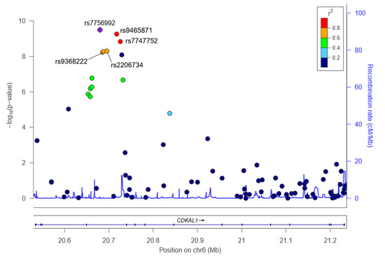Regional plot for CDKAL1_rs7756992, rs9465871, rs7747752, rs2206734, and rs9368222. The positions of the SNPs are shown at the top of the figure, and associations between SNPs in the CDKAL1 gene and diabetes are shown in the middle. The statistical significances (−log10 p-value) of associations with the SNPs are plotted. The recombination rates estimated using 1000 Genomes Nov 2014 Asian population data are shown by a blue line. The purple diamond with a SNP number represents the SNP most strongly associated with diabetes, and its correlations with other SNPs are shown by colors indicating the levels of linkage disequilibrium (r2). SNP map on chromosome 6p20: polymorphisms identified.
