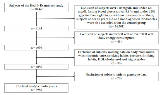 This study used KoGES-HEXA data from years 2004–2013 (n = 28,445). Among these HEXA cohort populations, 24,301 people with no data on diabetes were excluded from both cases and/or controls; subjects under 60 years old were excluded from the control group. Forty-eight people who had inadequate energy intake (< 500 kcal or > 5000 kcal), 38 people with missing data (about drinking habits, smoking status, physical activity, anthropometric measurements, and biochemical variables), and 70 people missing genotype data were excluded. Thus, 3988 individuals (Figure 2) constituted the actual analytic study group. The study protocol was reviewed and approved by the Institutional Review Board (IRB) of Inha University on January 31, 2020 (IRB No. 200129–1A).