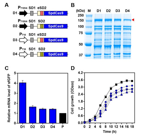 To control SpdCas9 expression in a gradient manner, we constructed four sets of BCD combinations (D1, D2, D3, and D4) that enable the expression of SpdCas9 (without the co-expression of sgRNA) at various intensities using two different strength promoters (strong P710V4 and weak P710) and SD parts (strong eSD2 and weak SD2): D1 was constructed with P710V4 and eSD2; D2 with P710V4 and SD2; D3 with P710 and eSD2; and D4 with P710 and SD2 (Figure 3A). After the cultivation of the cells in each combination, the SpdCas9 expression level in each cell group was determined by SDS-PAGE, and we found that the expression of SpdCas9 could be fine tuned by a combination of synthetic parts in BCD platforms. D1 expressed the highest expression of SpdCas9, and a moderate expression was observed in D2 and D3; above all, the combination of weak P710 and weak SD2 (D4) exhibited the weakest expression of SpdCas9 (Figure 3B).