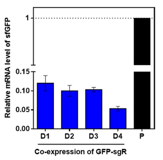 We examined whether the gene knock-down efficiency of the target gene could be properly maintained in cells by cooperating with sgRNA even when the expression of SpdCas9 was reduced. Maintaining a proper concentration between sgRNA and SpdCas9 is important for the effective repression of target genes in the CRISPRi system [30]. Therefore, when GFP-sgRNA was transcribed using the strong promoter (P710V4), the downregulation of the sfGFP gene in each SpdCas9 expression set (D1–D4) occurred, which was verified by qRT-PCR. The comparative analysis of the mRNA revealed that the transcription level of sfGFP was remarkably reduced by the co-expression of GFP-sgRNA and SpdCas9, and its level was gradually regulated by the SpdCas9 expression level (Figure 4). Cells harboring pGFP–sgR–D1–Em (strong expression of SpdCas9) showed the highest transcription level, but the cells harboring pGFP–sgR–D4–Em (weak expression of SpdCas9) showed the lowest transcription level, which was below 5% of the positive control (L. citreum JW001) (Figure 4). We found that the combination of sgRNA expression under strong P710V4 with D4 (weak expression of SpdCas9) was the most optimized system of CRISPRi for L. citreum.