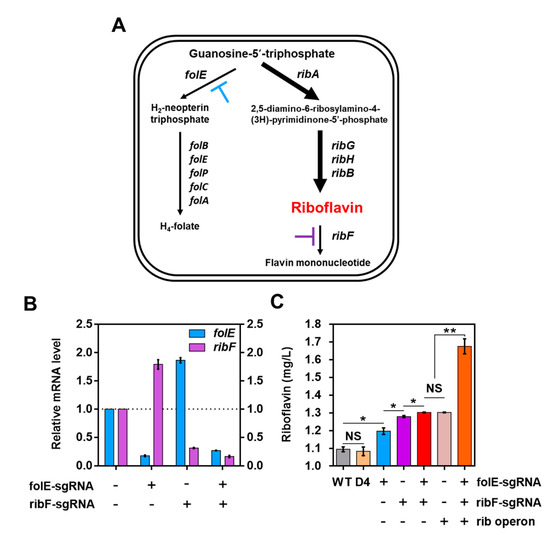 (A) Schematic diagram of the biosynthesis pathway of riboflavin in L. citreum. Blue and purple T-shaped bars represent the repression by CRISPRi with folE and ribF-specific sgRNA, respectively. (B) Transcription analysis of the folE and ribF genes by qRT-PCR. Blue and purple bars represent the transcription of folE and ribF genes, respectively. All the error bars represent the value of the standard deviation, which was calculated from three repeated experiments. (C) Identification of riboflavin accumulation via the designed CRISPRi system and the verification of the synergetic effect of riboflavin accumulation via combination with the CRISPRi system and the rib operon expression cassette. Wild-type (WT), L. citreum CB2567; D4, L. citreum CB2567 harboring plasmid pD4. The error bars represent the standard deviation of the samples. NS represents nonsignificant (p-value > 0.05), * p-value < 0.05, ** p-value < 0.01 based on the Student t-test.