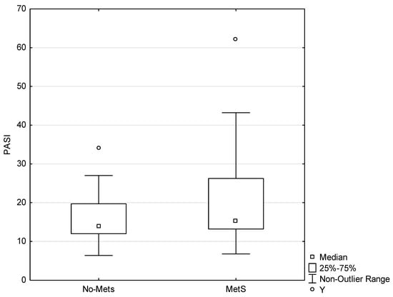 A total of 85 subjects were enrolled in the study. The age distribution did not differ significantly between the group of patients and the controls (Table 1). The study included 24 patients with MetS (MetS patients), 21 patients without MetS (no-MetS patients), 7 controls with MetS (controls MetS), and 33 controls without MetS (controls no-MetS). The prevalence of MetS was significantly higher among the patients (p < 0.01). There was no significant difference in the level of PASI score between the MetS patients and the no-MetS patients (p = 0.3567; Figure 1).