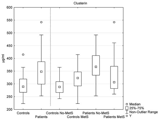 In the MetS patients (n = 24, median 307 µg/mL, interquartile range 282–369 µg/mL), the level of clusterin was significantly lower than in the no-MetS patients (n = 21, median 367 µg/mL, interquartile range 334–411 µg/mL), p < 0.05. In the no-MetS patients, the level was significantly elevated, in comparison with the no-MetS controls (n = 33, median 288 µg/mL, interquartile range 266–309 µg/mL), p < 0.001 (Figure 2).