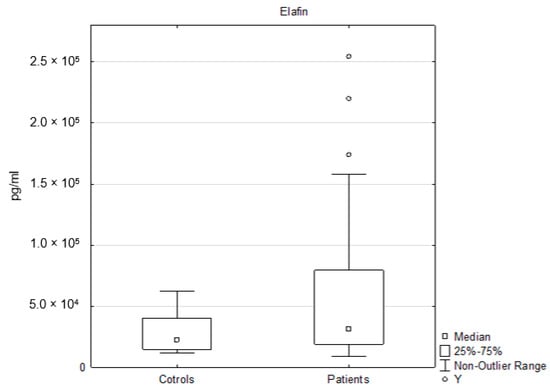 The serum level of elafin was significantly elevated in the patients, compared to the controls: patients (n = 45, median 30,900 pg/mL, interquartile range 18,800–79,400 pg/mL); controls (n = 40, median 22,250 pg/mL, interquartile range 14,700–40,400 pg/mL); p < 0.05 (Figure 3).