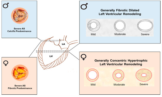 Of note, CAVD patients present sex-related differences also at the ventricular level. In patients with severe AS, excessive pressure causes cardiac hypertrophy and fibrosis, in particular LVH which can later lead to heart failure. In the 1990s, it was established that, in elderly patients, LVH develops in a sex-specific fashion [37,38,39]. The studies indicated that, in general, men develop a fibrotic, dilated cardiomyopathy, whereas more concentric and hypertrophic changes in the myocardium with ventricular dilatation and failure, taking place at advanced stages of CAVD, occur in women (Figure 2). These studies were also confirmed by several recent ones [40,41].