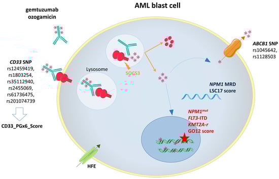Different studies support the critical role of leukemic stem cells (LSC) in AML maintenance. LSC are characterized by intrinsic properties of cell cycle quiescence, self-renewal and increased drug efflux which confer chemotherapy resistance [8,103,104]. A recent study based on five independent AML cohorts (n = 908 patients) set up the LSC17 score, derived from a 17-gene expression signature for LSC [105]. This score stands for a strong prognostic factor in AML. Interestingly, in the ALFA-0701 trial, the addition of GO correlated with improved outcome in patients with low but not high LSC17 score (EFS: HR: 0.42, p = 0.001; RFS: HR: 0.53, p = 0.03). Hence, the LSC17 score appears as relevant biomarker to predict GO benefit in AML patients [105].