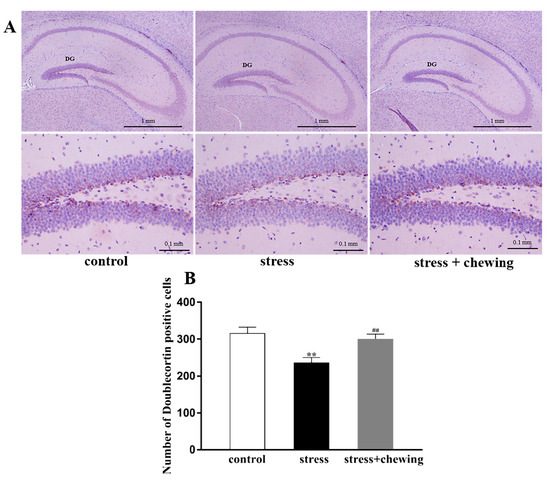Maternal chewing during prenatal stress ameliorated hippocampal neurogenesis impairments in offspring. (A) Photomicrographs showing doublecortin-positive cells in the hippocampus. (B) The number of doublecortin-positive cells in the hippocampal dentate gyrus (DG) region (** p < 0.01 vs. control group, ## p < 0.01 vs. stress group, n = 9 per group). All data are shown as mean ± SEM.