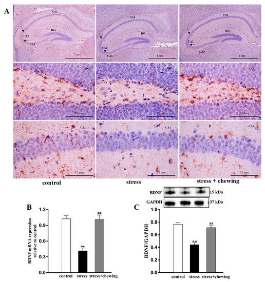 Maternal chewing during prenatal stress increased brain-derived neurotrophic factor (BDNF) expression in the hippocampus in offspring. (A) Photomicrographs showing positive BDNF expression in the hippocampus. (B,C) (** p < 0.01 vs. control group, ## p < 0.01 vs. stress group, n = 9 per group). All data are shown as mean ± SEM.