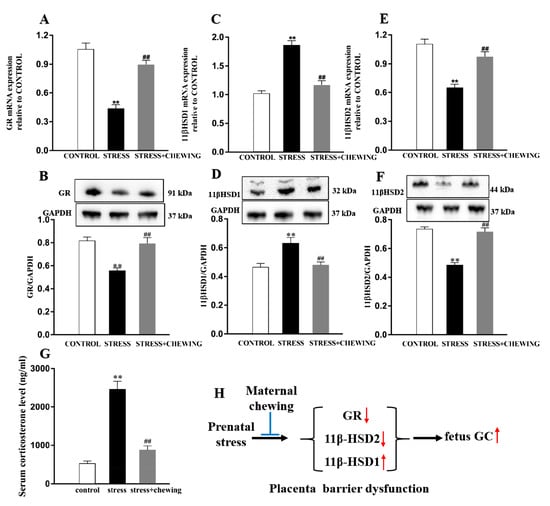 Maternal chewing during prenatal stress deceased the glucocorticoid (GC) level in the mouse offspring by protecting the placenta barrier function. (A,B) The mRNA and protein expression of glucocorticoid receptor (GR) in the placenta. (C,D) The mRNA and protein expression of 11β-HSD1 in the placenta. (E,F) The mRNA and protein expression of 11β-HSD2 in the placenta. (G) The serum corticosterone level in the mouse offspring. (H) Maternal chewing attenuated prenatal stress-induced increase in GC level in the mouse offspring by protecting placenta barrier function (** p < 0.01 vs. control group, ## p < 0.01 vs. stress group, n = 9 per group). All data are shown as mean ± SEM.