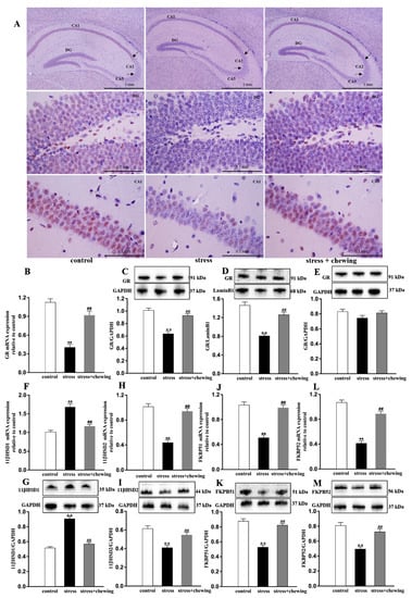 Maternal chewing during prenatal stress ameliorated the nuclear GR transport impairment induced by prenatal stress. (A) Photomicrographs showing the positive GR expression in the hippocampus. (B–E) The mRNA, total protein, nuclear and cytoplasmic protein expression of GR. (F,G) The mRNA and protein expression of 11β-HSD1. (H,I) The mRNA and protein expression of 11β-HSD2. (J,K) The mRNA and protein expression of FKBP51. (L,M) The mRNA and protein expression of FKBP52 (** p < 0.01 vs. control group, ## p < 0.01 vs. stress group, n = 9 per group). All data are shown as mean ± SEM.