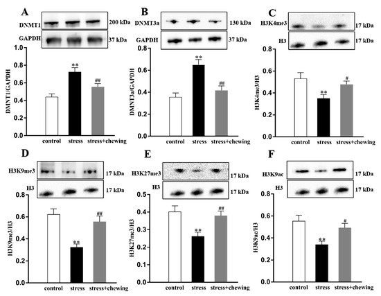 2.6. Maternal Chewing during Prenatal Stress Regulated Enzymes of DNA Methylation as Well as Histone H3 Methylation and Acetylation in the Offspring