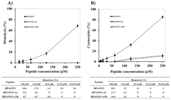 Previously, we determined the properties of HPA3NT3 as an antimicrobial peptide. This peptide has an amphipathic helical structure, strong antimicrobial activity, and cytotoxic ability at 250 μM (sheep RBCs, 68.4%; HaCaT cells, 85.1%) [15]. This peptide was designed to have low cytotoxicity at higher concentrations and was generated by substituting phenylalanine with alanine and lysine (F1A, F8A, and N13K) to enhance its antimicrobial activity by increasing the net positive charge. This peptide was named as HPA3NT3-A2 and showed higher antimicrobial activity against microorganisms, no hemolytic activity (0%) at 250 μM, and significantly reduced toxicity (11.7%) against HaCaT cells at 250 μM [15]. Furthermore, all l-form lysine residues in HPA3NT3-A2 were replaced with d-enantiomer lysine residues to prevent peptide bond cleavage by proteolytic enzymes (such as serine proteases), and the resulting peptide was named as HPA3NT3-A2D. This peptide exhibited reduced hydrophobicity, non-hemolysis (HPA3NT3-A2D data overlapped with those of HPA3NT3-A2) against sheep RBCs, and reduced toxicity (10.4%) against HaCaT cells compared to HPA3NT3 (Table 1, Figure 1).