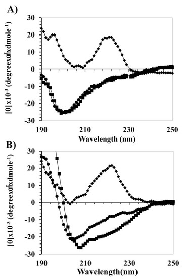 To understand the activity–structure relationship of peptides, the secondary structures of peptides in an aqueous solution (10 mM sodium phosphate, pH 7.2) and membrane environments, sodium dodecyl sulfate (SDS) (A) and Trifluoroethanol (TFE) (B) buffer were determined by CD spectra (Figure 2).