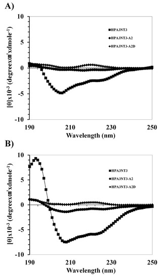 CD spectra for HPA3NT3 (■), HPA3NT3-A2 (●), and HPA3NT3-A2D (◆) recorded in 30 mM sodium dodecyl sulfate (SDS, pH 7.2) buffer (A) or 30% trifluoroethanol (FTE) buffer (B). Mean values are presented; n = 3.