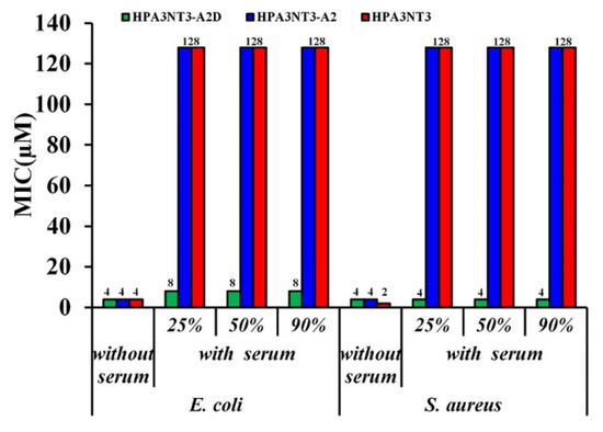 Previous studies demonstrated that proteolytic enzymes degrade peptide bonds at the carboxyl end of antimicrobial peptides under physiological conditions such as those containing serine protease, which is a proteolytic enzyme that cleaves peptide bonds (such as lysine and/or arginine residues) [22]. Our results suggest that the peptide bonds of HPA3NT3-A2 are cleaved at the lysine residue on the carboxyl end by trypsin. Therefore, all l-forms of lysine residues in the parental HPA3NT3-A2 peptide were substituted with d-enantiomer residues. Reversed-phase HPLC of peptides in the serum revealed the degradation of the HPA3NT3-A2 and/or -A2D peptide. Furthermore, the antimicrobial activities of all peptides were tested in 25%, 50%, and 90% serum against E. coli and S. aureus. HPA3NT3-A2D maintained its antimicrobial activity (4–8 μM), whereas all l-forms of HPA3NT3 and HPA3NT3-A2 showed no bactericidal activity (>64 μM). These results suggest that cleavage of the peptide bonds in HPA3NT3-A2D by proteolytic enzymes was prevented in serum.