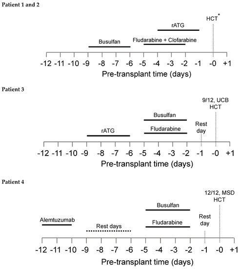 Conditioning regimen for all four patients. *8/8 UCB HCT and 7/8 UCB HCT for patients 1 and 2, respectively.