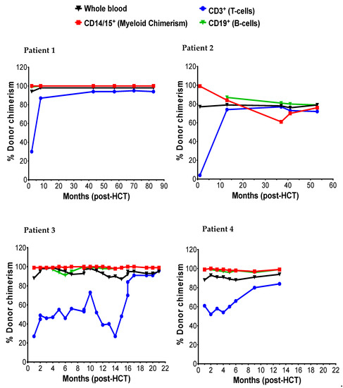- Ozyurek, E.; Cowan, M.J.; Koerper, M.A.; Baxter-Lowe, L.-A.; Dvorak, C.; Horn, B.N. Increasing mixed chimerism and the risk of graft loss in children undergoing allogeneic hematopoietic stem cell transplantation for non-malignant disorders. Bone Marrow Transplant. 2008, 42, 83–91. [Google Scholar] [CrossRef]