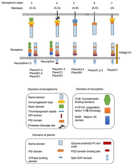 Semaphorins are a large family of proteins involved in different physiological and pathological processes. Semaphorins have been discovered from viruses, in insects to mammals, and are expressed in most tissues []. As illustrated in Figure 1, the semaphorin family includes 30 proteins that are divided into eight classes based on structural features and distribution among different phyla []. Class-1 semaphorins [] and Class-2 semaphorins [] are found only in invertebrates, while Class 3–7 semaphorins are found only in vertebrates [] (except for Sema5C, which is also found in invertebrates []). Semaphorin V members express in viruses. All semaphorins contain an approximate 500 amino acid extracellular Sema domain []. In addition to the Sema domain, semaphorins also contain the plexin-semaphorin-integrin (PSI) domain, and distinct protein domains that are expressed by different subclasses, including immunoglobulin-like (Ig), thrombospondin, and basic C-terminal domains []. The receptors for semaphorins include plexins, neuropilins [], and other molecules, such as integrins, proteoglycans, and receptor tyrosine kinase(RTKs) []. Plexins, which are found in vertebrates and fall into Classes A–D, also contain the extracellular Sema domains []. Several recent studies on the structure of semaphorins confirmed that each Sema domain of a semaphorin homodimer binds to a Sema domain of plexins to promote plexin dimerization for signal transduction [,,].
