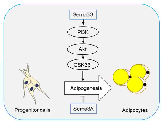 Semaphorins in adipogenesis. Adipocytes originate from progenitor cells through a process called adipogenesis. Sema3G has been reported to stimulate adipogenesis through the PI3K/Akt/GSK3β signaling pathway, while Sema3A plays an inhibitory role.