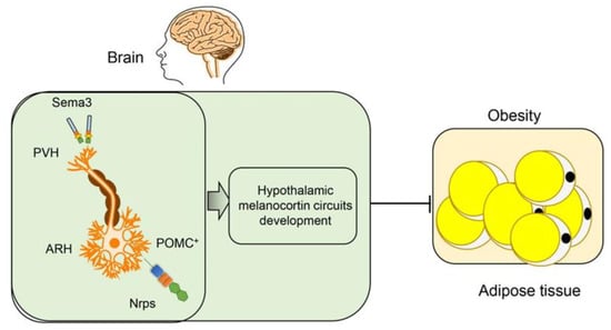 In a recent paper, van der Klaauw et al. examined the role of Class-3 semaphorins signaling in the development of ARH-PVH circuits. They found 40 rare variants in Sema3A–3G and their receptors (Plexin1–4 and Nrp1 and -2) in severely obese individuals. Rare variants in these genes were enriched in 982 severely obese individuals as compared with the controls. Deletion of seven Class-3 semaphorin members in zebrafish has led to adiposity. Sema3 members expressed in the hypothalamic PVH, and their receptors Nrps and plexins expressed on the POMC+ neurons in the ARH. In mice, neuropilin-2 receptor (Nrp2) deletion in POMC neurons disrupted their projections from the ARH to the PVH, reduced energy expenditure, and caused weight gain. Cumulatively, the results showed that Class-3 semaphorins contributed to the development of hypothalamic melanocortin circuits involved in energy homeostasis and obesity (Figure 3) [,].