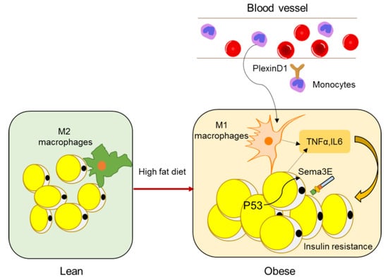 - Shimizu, I.; Yoshida, Y.; Moriya, J.; Nojima, A.; Uemura, A.; Kobayashi, Y.; Minamino, T. Semaphorin3E-induced inflammation contributes to insulin resistance in dietary obesity. Cell Metab. 2013, 18, 491–504. [Google Scholar] [CrossRef]