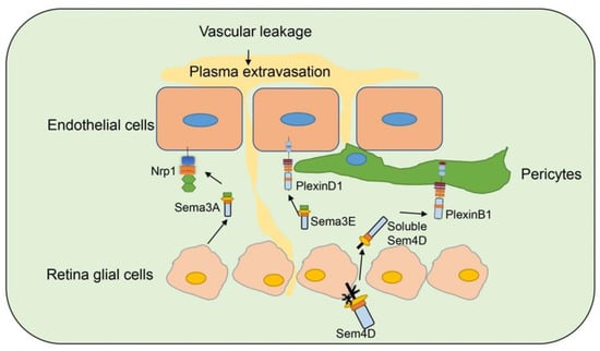 Semaphorins in diabetic retinopathy. Several semaphorin family members are involved in diabetic retinopathy. Sema3A is secreted by retina glia cells and bind to Nrp1 on endothelial cells to induce vascular permeability. Sema3E is secreted by neural cells in retina and binds to PlexinD1 on endothelial cells and normalizes angiogenic directionality in the retina. Sema4D on retina glia cells can be cleaved and secreted as soluble Sema4D. Soluble Sema4D binds to PlexinB1 on pericytes and induces pericyte loss and vascular leakage.