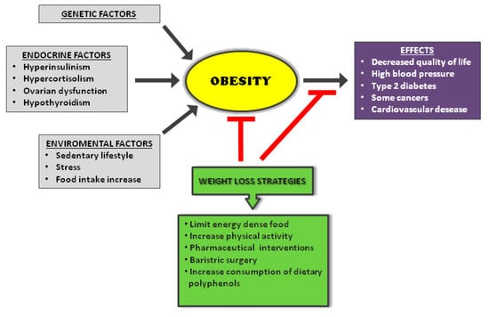 The treatment of obesity is always inevitably associated with the reduction of body weight. This can be achieved through various strategies, which include lifestyle interventions (diet and exercise), normalizing the lipid metabolism, pharmaceutical interventions, or bariatric surgery [18]. Recent studies have shown that some natural dietary factors can influence body weight by representing a valid strategy to prevent obesity. In particular, the food intake of polyphenols can help reduce the physiological weight gain that occurs over time in the general population.