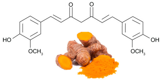 Curcumin (Figure 4) is the most bioactive polyphenol in the Curcuma longa, a plant usually consumed as a spice in India and other Asian states. It has been used for thousands of years in a medicine of Ayurveda, which means “science of long life”, and the first records about the turmeric as a useful medicine are dated 3000 B.C. Curcumin exerts several biological functions, including antioxidation, anti-inflammation, and antiangiogenesis, in different organs, including adipose tissue [58,59]. There is substantial evidence about effectiveness of curcumin in stimulating β-oxidation, inhibiting fatty acid synthesis, and decreasing fat storage [60,61].