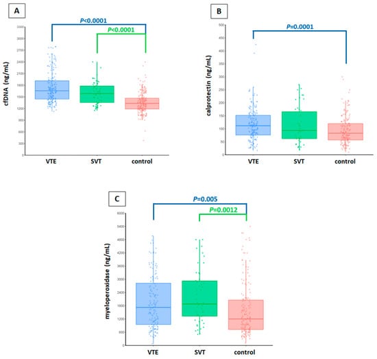 Differences in the levels of each neutrophil activation marker between VTE patients and controls were analyzed with a linear regression model. We observed a very significant increase in cfDNA levels in lower extremity VTE patients (median; 25th–75th percentile, 1657.6; 1443.6–1914.1) (p < 0.0001) and SVT patients (1586.4; 1348.9–1782.9) (p < 0.0001) compared to controls (1320.9; 1185.7–1465.6) (Figure 1A). Similarly, a very significant increase in calprotectin levels was observed in lower extremity VTE patients (112.1; 75.1–152.6) compared to healthy controls (83.0; 55.0–120.0) (p = 0.0001) (Figure 1B). Finally, an increase in MPO levels was also observed in lower extremity VTE patients (1728.5; 947.0–2855.0) (p = 0.005) and in SVT patients (1882.5; 1235.0–2970.0) (p = 0.0012) compared to controls (1250.0; 712.5–2102.0) (Figure 1C).
