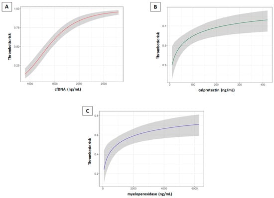 As depicted in Figure 2A, at low levels of cfDNA the risk of thrombosis was very low, increasing very sharply until reaching a risk near 1 with a plasma cfDNA concentration ≥2500 ng/mL. Regarding calprotectin (Figure 2B) and MPO (Figure 2C), the risk of thrombosis increased following a logarithmic curve, with a higher slope at low values. Furthermore, since slightly higher levels of neutrophils were found in plasma of healthy controls compared to that of patients’ and these may modify the levels of neutrophil activation markers, we repeated the multivariable logistic regressions adjusting by the aforementioned variables and neutrophil counts, and no differences in the ORs were observed (data not shown).