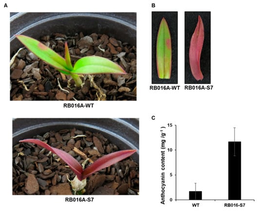 Anthocyanins are pigments that confer color to various plant parts []. The color is determined by the composition and concentration of pigments, which vary greatly among plant species []. Cyanidin-3-glucoside is a major anthocyanin found in most plants []. Other common anthocyanin pigments present in plants include delphinidin, pelargonidin, peonidin, malvidin, and petunidin. Earlier studies on Dendrobium orchids primarily focused on anthocyanin profiles in flowers and stems, which contain pelargonidin, cyanidin, peonidin, delphinidin, and/or malvidin []. In contrast, we were only able to detect malvidin in the leaves of D. bigibbum (data not shown), and its levels were associated with increased purple pigmentation in the RB016-S7 mutant’s leaves. Thus, anthocyanin pigments present in leaves versus flowers and stems might be associated with the specific genes expressed in these tissues. We determined that the increased anthocyanin accumulation in RB016-S7 was associated with increased expression levels of PAL, CHS, F3′H, and DFR genes that are involved in anthocyanin biosynthesis. Although the anthocyanin biosynthetic genes are well-conserved, the timing, level, and spatial distribution of anthocyanin biosynthesis are primarily determined by TFs.