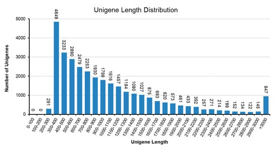 - Grabherr, M.G.; Haas, B.J.; Yassour, M.; Levin, J.Z.; Thompson, D.A.; Amit, I.; Adiconis, X.; Fan, L.; Raychowdhury, R.; Zeng, Q. Full-length transcriptome assembly from RNA-Seq data without a reference genome. Nat. Biotechnol. 2011, 29, 644. [Google Scholar] [CrossRef] [PubMed]