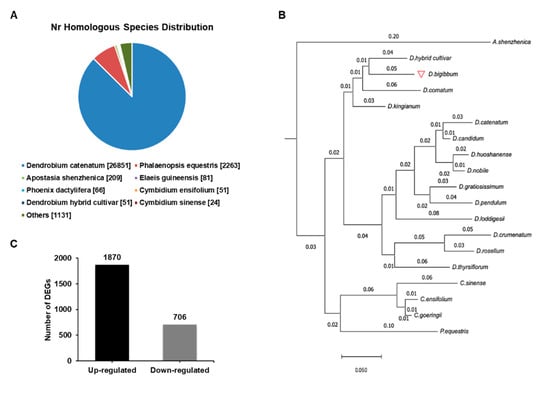 Species distribution of the BLAST search results in the nr database. (A) A cut off E-value of 10−5 was used. Different species are indicated by different colors. (B) A reference phylogenetic tree derived from rDNA ITS 2 sequences of 14 species of Dendrobium, 3 species of Cymbidium, Apostasia shenzhenica, and Phalaenopsis equestris. (C) The number of up- and downregulated differentially expressed genes (DEGs) in the wild type versus RB016-S7 mutant comparison.