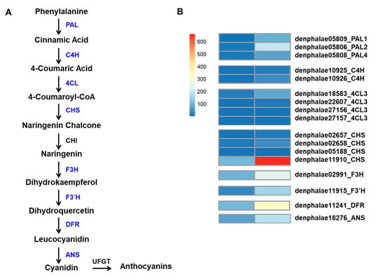 Flavonoid–anthocyanin biosynthetic genes in D. bigibbum. (A) The differentially expressed genes (DEGs) between the WT and RB016-S7 mutant found in leaves are highlighted in blue. Phenylalanine ammonia-lyase, PAL; cinnamic acid 4-hydroxylase, C4H; 4-coumarate CoA-ligase, 4CL; chalcone synthase, CHS; chalcone isomerase, CHI; flavanone 3-hydroxylase, F3H; flavonoid 3′-monooxygenase, F3′H; dihydroflavonol 4-reductase, DFR; and anthocyanidin synthase, ANS. (B) Expression profiles determined using fragments per kilobase of transcript per million mapped reads (FPKM) values obtained from RNA-Seq data. Expression values (as FRKM) were not scaled per row to allow the visualization of original FPKM values among samples. The heatmap was generated using the R package pheatmap.