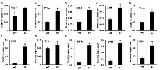 qRT-PCR analysis of 10 genes showing altered expression levels in the RNA sequencing (RNA-Seq) analysis. The genes were associated with anthocyanin biosynthesis. More specifically, (A–J) indicate the relative expression levels of PAL1, PAL2, PAL3, C4H, 4CL, CHS, F3H, F3′H, DFR, and ANS, respectively. The elongation factor 1-alpha (EF1a) gene served as an internal control. Error bars indicate standard deviations (n = 3). The experiment was repeated three times with similar results. Asterisks denote a significant difference between respective WT and RB016-S7 mutant leaves samples (t-text, p < 0.0001).