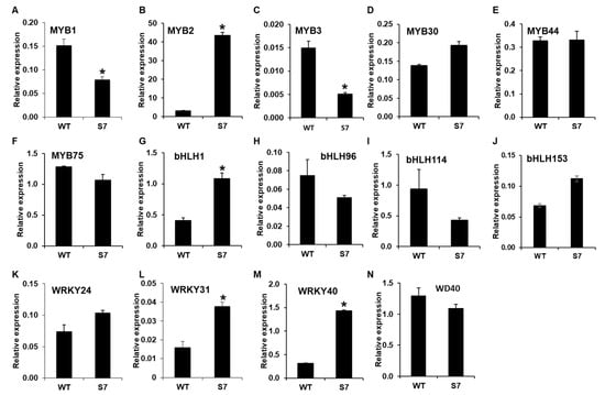 Comparisons of expression levels of genes encoding bHLH TFs showed that only DbbHLH1 was expressed at higher levels in RB016-S7 than WT plants. In comparison, DbbHLH96, -114, and -153 showed WT-like expression levels. DbWD40, which showed a 67.97% identity to the Arabidopsis ortholog AtTTG1, had a WT-like expression level []. A recent report also suggests roles for WRKY TFs in anthocyanin biosynthesis. RNA-Seq data showed that several WRKY TFs were highly expressed in the RB016-S17 mutant compared with WT. However, the qRT-PCR analysis was only able to confirm ~1.5–3-fold inductions of DbWRKY24, WRKY31, and WRKY40 genes (Figure 6). Thus, only a select group of TFs were upregulated in the mutant plant, and these, in turn, could play roles in the regulation of genes involved in anthocyanin biosynthesis.