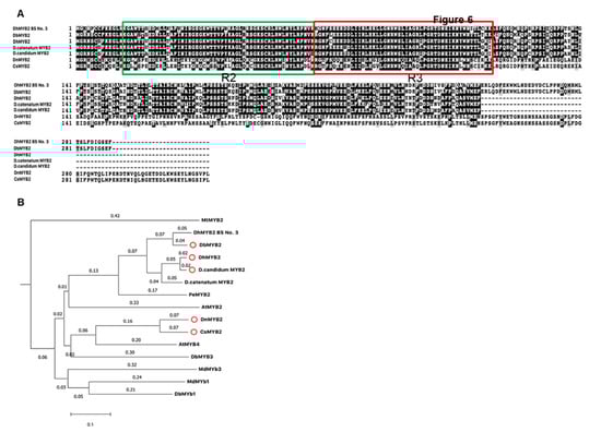 Sequence alignments and phylogenetic tree of DbMYB2 from orchids with known R2R3-MYBs domain. (A) Alignments of the full-length deduced amino acid sequences of DbMYB2 with other R2R3-MYBs present in other orchids. (B) Phylogenetic relationship of DbMYB2 with known anthocyanin MYB regulators from other orchid species.