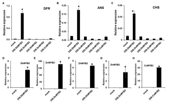 D. bigibbum is an epiphytic or lithophytic orchid that contains cylindrical pseudobulbs, each having between three and five green or purplish leaves and arching flowering stems with up to 20 usually lilac-purple flowers. The D. bigibbum plants containing purple spots on their leaves are very popular in the commercial market. Although colorful leaves and flowers add significant ornamental values to orchids, our understanding of the differential pigmentation in D. bigibbum remains limited. Natural agents extracted from various parts of Dendrobium contain bioactive substances, such as phenolic compounds, anthocyanins, and polysaccharides [,,]. Many of these phenolic compounds and anthocyanins have well-known antioxidant activities [] and contribute to leaf and flower coloration []. Anthocyanins are water-soluble, which are present in the vacuoles of plant epidermal cells and impart an orange, red, or blue color to flowers, fruits, stems, leaves, and roots []. Anthocyanin biosynthesis is a well-studied secondary metabolic pathway in plants that involves the conversion of phenylalanine into 4-coumaryl-CoA, followed by their conversions to flavonoid compounds. Studies in antirrhinum [], petunia [,], maize [,], Brassica [,], and Arabidopsis [,] have identified genes that regulate anthocyanin production, and these can be broadly classified into two major groups. The first group consists of enzymes that participate in anthocyanin biosynthesis, including phenylalanine ammonia-lyase (PAL), chalcone synthetase (CHS), chalcone isomerase (CHI), flavanone 3-β-hydroxylase (F3H), dihydroflavonol 4-reductase (DFR), anthocyanin synthase (ANS), and UDP-glucose flavonoid 3-O-glucosyl transferase []. Loss-of-function mutations in CHS, CHI, F3H, DFR, or ANS abolish anthocyanin biosynthesis, and plants harboring these mutations often produce colorless tissues [,,,,]. Anthocyanin accumulations in green and red leaves of Dendrobium officinale stems have been associated with ANS and UDP-glucose flavonoid 3-O-glucosyl transferase expression []. Moreover, Yu et al. suggested that among anthocyanins, delphinidin 3,5-O-diglucoside and cyanidin 3-O-glucoside may be responsible for the red peel color of D. officinale []. The second group contains MYBs, basic helix-loop-helixes (bHLHs), or WD40 repeat transcription factors (TFs) that regulate the expression levels of genes involved in anthocyanin biosynthesis [,]. Earlier studies on Arabidopsis and Medicago truncatula indicated that MYB2 acts as a transcriptional repressor of anthocyanin biosynthesis and that the overexpression of MYB2 abolishes anthocyanin biosynthesis [,]. However, the overexpression of orchid MYB2 in petunia results in increased petal pigmentation []. Likewise, the transient overexpression of Phalaenopsis equestris MYB2 positively regulates anthocyanin pigmentation and is associated with the increased expression of downstream genes PeF3H5, PeDFR1, and PeANS3 []. Conversely, silencing of PeMYB2 results in reduced anthocyanin accumulation []. Thus, depending on the plant system, MYB2 appears to serve as either a negative or positive regulator of anthocyanin biosynthesis.