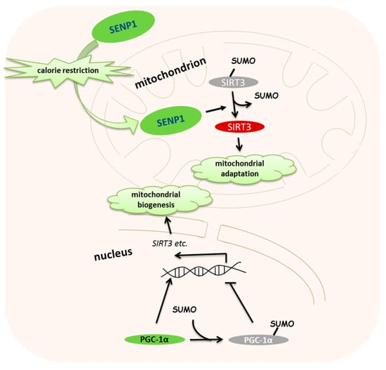It is worthwhile to note that the components of the SUMOylation system can be regulated by phosphorylation. Similar to SUMOylation, there are some proteins which phosphorylation associates with mitochondrial oxidative stress. Accumulating evidence shows that there is an inter-connection between SUMOylation and phosphorylation [,,,]. Recent studies have shown that obesity and aging decrease SIRT1-mediated SIRT3 deacetylation and reduce SIRT3 stability and activity []. Nutrient stress can also alter SIRT1 expression to affect mitochondrial biogenesis via the deacetylation of PGC-1α []. In response to mitochondrial stress, the regulating effects of deacetylation are consistent with deSUMOylation in mitochondria. Accordingly, the development of synergistic agonists for SENP1 and SIRT1 is expected to improve mitochondrial health.