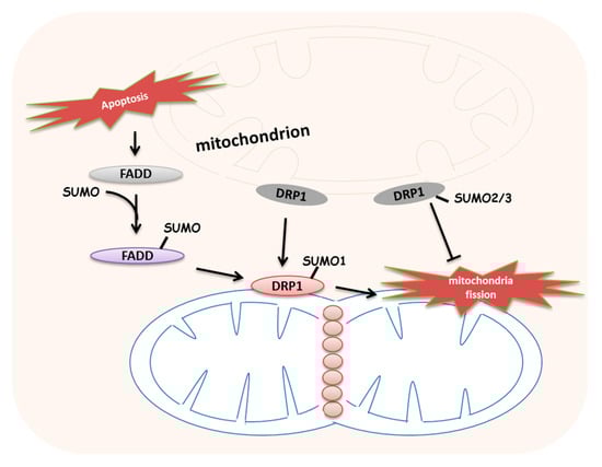 Small ubiquitin-related modifier (SUMO)ylation regulates mitochondrial morphology upon stress. Upon mitochondrial stress, SUMO1-modified dynamin-related protein 1 (DRP1) is protected from degradation and promotes mitochondrial fragmentation. However, SUMO2/3-conjugated DRP1 inhibits mitochondrial fission and cytochrome c release, and SUMOylated Fas-associated protein with death domain (FADD) promotes DRP1; DRP1-mediated mitochondrial fragmentation during apoptosis and necroptosis.