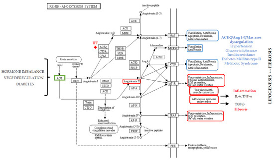 In 2013 and 2014, our proteomic studies on the BAL of IPF patients, compared with the profiles of healthy smoker and non-smoker controls, reported a dysregulation in proteins involved in the RAAS [18]. In particular, the down-regulation of ANGT in the BAL of IPF patients with respect to the other conditions was reported. Angiotensinogen is the substrate of renin and its down-regulation in IPF strongly suggests high renin and ANGT consumption to produce angiotensin I. Indeed, renin converts ANGT into angiotensin I (Ang I), which is in turn cleaved into angiotensin II (Ang II) by angiotensin-converting-enzyme (ACE), also typically found in the endothelial cells of the lung capillaries [46], where RAAS, essential for blood pressure control and fluid homeostasis, plays an important role in pulmonary hypertension. Plasma levels of ANGT are reported to be modulated by hormones such as corticosteroid, oestrogen, thyroid hormones and angiotensin II [46,47], suggesting that hormone imbalance could influence RAAS and its dysregulation. The important role of RAAS in metabolic regulation is also explained by its two axes: ACE-2/Ang 1–7/Mas which has antiproliferative, antioxidant and anti-inflammatory functions with beneficial effects on hypertension, glucose intolerance and insulin resistance (IR); and the counter-regulatory ACE/Ang II/AT1 [48] with opposite effects. ACE-2 has been shown to play a protective role in lung disease through effects mediated by the Mas oncogene. In the lung of IPF patients, ACE-2 is reported to be significantly depleted [49], suggesting that RAAS is important in the pathogenesis of IPF. In turn, the dysregulation of RAAS components can trigger many metabolic functions, such as those observed in metabolic syndrome and diabetes mellitus type 2 [48]. Indeed, in diabetic retinopathy, RAAS is an effector of vascular epithelial growth factor (VEGF) that drive the leakage of retinal blood vessels [50]. VEGF is also well known to be one of the major players in IPF onset and its receptor is one of the targets of nintedanib treatment [11,51].